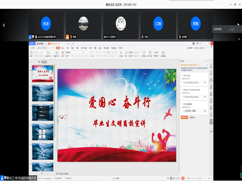 學院精心為每位畢業(yè)生制作畢業(yè)紀念優(yōu)盤,表達學院對畢業(yè)生的殷殷期盼,望石化學子奔涌前行;畢業(yè)學子創(chuàng)作畢業(yè)歌曲《化說再見》,記錄別樣青春時光;畢業(yè)典禮嚴肅活潑,讓畢業(yè)生擁有難忘且珍貴的記憶;考研宿舍感恩活動傳遞正能量,難忘宿管阿姨、食堂阿姨的關(guān)懷照顧;畢業(yè)班會憶往昔話今朝,師生情深,不說再見;考研學霸班級勵志成長,激勵石化學子乘風破浪;“青年講師團”畢業(yè)文明離校宣講活動,傳遞愛國情,砥礪奮斗行;誠信教育線上活動,學生感恩資助,自立自強;畢業(yè)班黨員學習經(jīng)驗分享,不忘初心,揚帆遠航;考研經(jīng)驗交流,站在學長學姐的肩膀,逐夢前行。
