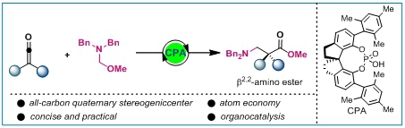 孫江濤團隊發(fā)展了一種以烯酮和N,O-縮醛為原料,在手性磷酸催化下實現(xiàn)了烯酮的不對稱胺甲基化,從而簡潔、高效、綠色合成光學(xué)純的β2,2-氨基酸的新方法。