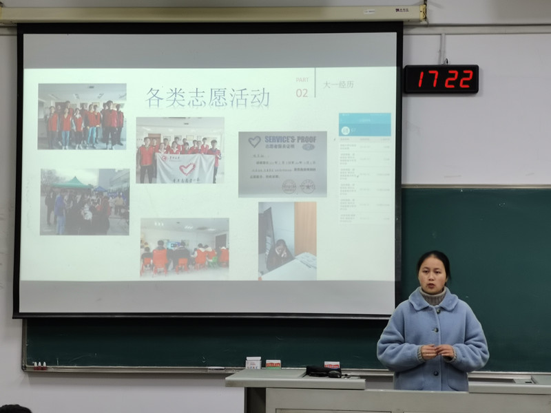 活動中,兩位代表都結(jié)合自身學(xué)習(xí)經(jīng)歷和獲獎經(jīng)驗,分別從學(xué)習(xí)、工作和生活方面做了重點交流。趙云主要通過講述自己準(zhǔn)備比賽和參與比賽的經(jīng)歷,鼓勵同學(xué)們學(xué)會自己抓住機會,勇往向前。喻榮融就學(xué)習(xí)考證方面展開詳細講解,建議同學(xué)們利用好平日的學(xué)習(xí)時間,并在學(xué)有余力的時候多多參加各類競賽?;顒幼詈螅瑑晌淮砀嬖V同學(xué)們無論什么時候開始努力都不算晚。