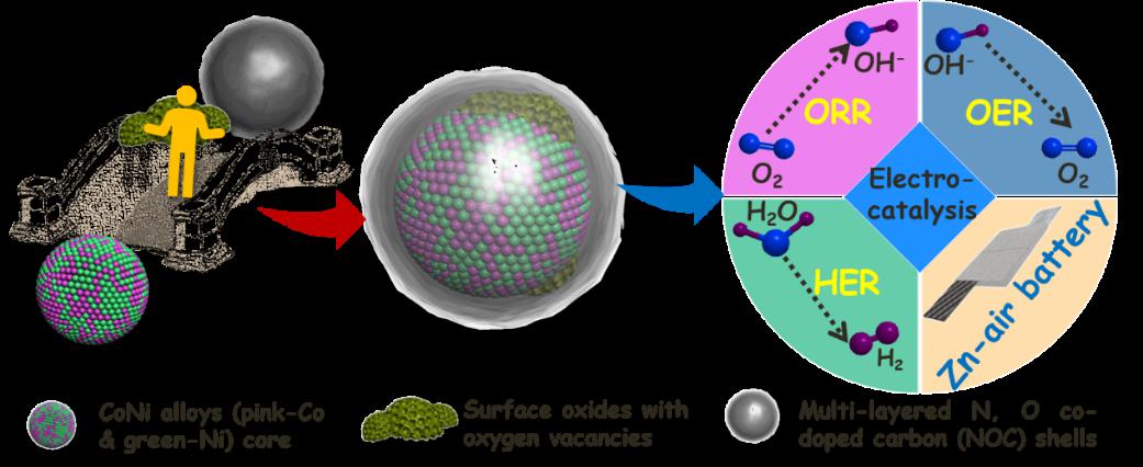 氧氣還原、氧氣析出以及氫氣析出等小分子電催化反應(yīng)是鋅空氣電池、鋰空氣電池、燃料電池以及電化學(xué)分解水制氫等能量存儲(chǔ)與轉(zhuǎn)換技術(shù)的核心反應(yīng),然而它們均是動(dòng)力學(xué)慢反應(yīng),都需要使用催化劑來(lái)加速它們的反應(yīng),從而提高存儲(chǔ)和轉(zhuǎn)換效率。在單一催化劑上實(shí)現(xiàn)多功能電催化一直是該領(lǐng)域研究的熱點(diǎn)和重點(diǎn),這對(duì)于降低上述能量存儲(chǔ)與轉(zhuǎn)換器件結(jié)構(gòu)的復(fù)雜性、大幅度提高性能,促進(jìn)它們的產(chǎn)業(yè)化都具有重要意義。銀鳳翔-陳標(biāo)華課題組的何小波副研究員利用CoNi-雙金屬有機(jī)骨架材料為前驅(qū)體,開發(fā)了一種“表面輕微氧化的CoNi 合金@氮/氧共摻雜碳”的多功能催化劑。這種多功能催化劑擁有媲美于貴金屬催化劑的氧氣還原、氧氣析出以及氫氣析出的高效電催化性能。更為突出的是,這種電催化劑使得鋅空氣電池?fù)碛?/span>98.6%的理論比容量和74.8%的理論能量密度,并且超過(guò)100小時(shí)運(yùn)行后鋅空氣電池的性能幾乎沒(méi)有衰減。深入的構(gòu)-效關(guān)系研究發(fā)現(xiàn),該催化劑中CoNi合金納米顆粒表面存在的少量氧化層起到了關(guān)鍵作用。這種關(guān)鍵作用主要體現(xiàn)在以下兩個(gè)方面:(一)少量氧化層“富含”氧空位,氧空位促進(jìn)了從CoNi合金納米顆粒(核心)到氮/氧共摻雜碳(外殼)的電子轉(zhuǎn)移,從而優(yōu)化了在電催化過(guò)程中起直接催化作用的氮/氧共摻雜碳中活性位的電子結(jié)構(gòu)及其對(duì)反應(yīng)物種的吸脫附能力,最終使得CoNi合金納米顆粒(核心)和氮/氧共摻雜碳(外殼)在多功能電催化過(guò)程中能夠分別“間接”與“直接”地貢獻(xiàn)各自的作用;(二)“富含”氧空位的少量氧化層還增強(qiáng)了催化劑的整體導(dǎo)電性,從而促進(jìn)了催化劑、電解液與氣態(tài)反應(yīng)物(產(chǎn)物)之間的三相界面電荷轉(zhuǎn)移,最終有利于加速多功能電催化反應(yīng)過(guò)程。