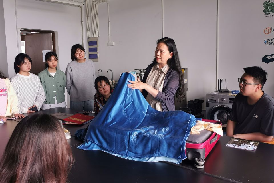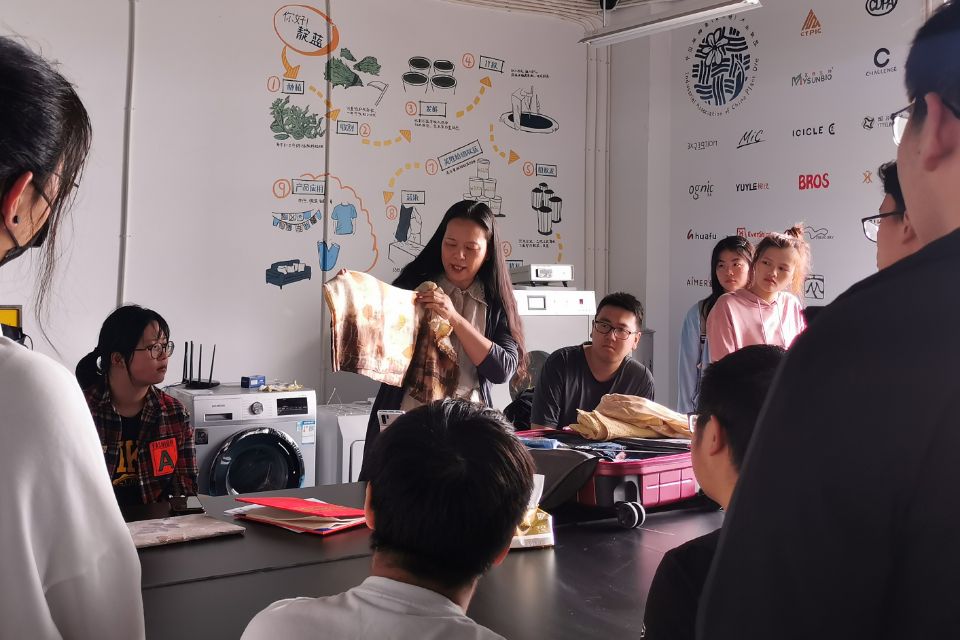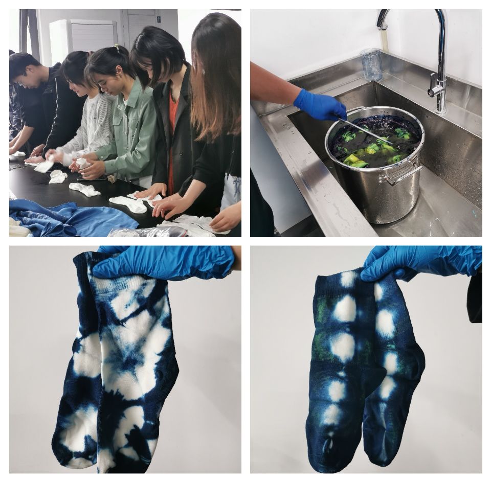 紀(jì)老師首先為同學(xué)們介紹了植物染的原料和原理,邊講解邊展示通過不同原料和印染方式得到的各種作品,讓同學(xué)們直觀地認(rèn)識(shí)植物染。接著進(jìn)行互動(dòng)提問,同學(xué)們對(duì)不同面料染色度、植物染料與合成染料的結(jié)構(gòu)、植物染提取過程中的助劑等提出疑問,紀(jì)老師一一進(jìn)行了解答。最后同學(xué)們動(dòng)手體驗(yàn)扎染,將布料浸濕后折疊捆扎,然后浸入色漿進(jìn)行染色,創(chuàng)作出屬于自己獨(dú)一無二的植物染作品。