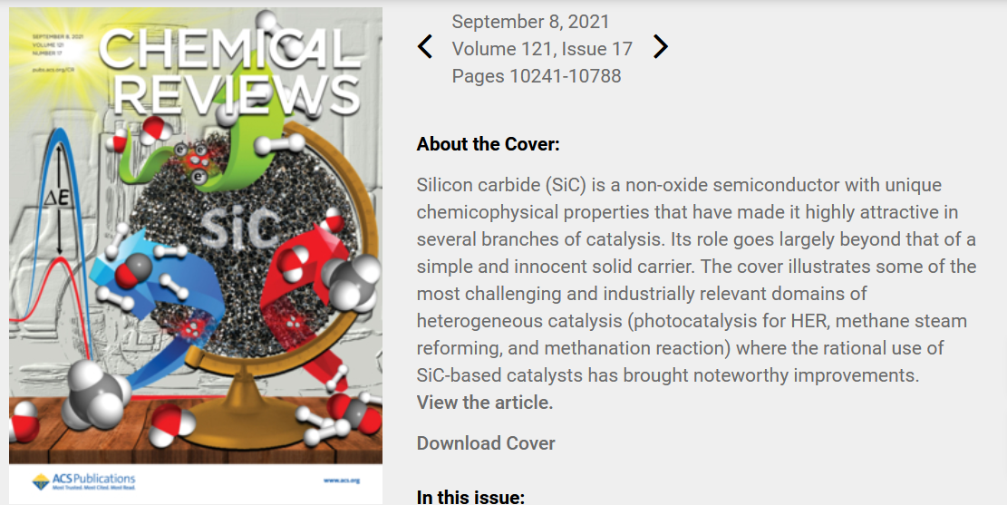 近日,郭向云教授應(yīng)邀與意大利國家研究委員會(huì)、中科院大連化學(xué)物理研究所、SICAT公司、法國國家科研中心等研究人員合作撰寫的關(guān)于高比表面積碳化硅催化應(yīng)用的綜述文章“Porous Silicon Carbide (SiC): A Chance for Improving Catalysts or Just Another Active-Phase Carrier?”在化學(xué)領(lǐng)域國際頂級綜述類雜志Chemical Reviews上作為封面文章發(fā)表。該論文系統(tǒng)地介紹了碳化硅作為催化劑載體在催化領(lǐng)域中的應(yīng)用情況:(1)精細(xì)化學(xué)品合成,如烷烴氧化制烯烴和含氧化合物、不飽和鍵加氫、C-X鍵形成等;(2)燃料制備,如各種液體燃料、天然氣和氫氣;(3)環(huán)境保護(hù)和修復(fù),如水和空氣中有機(jī)污染物的氧化脫除及分解;(4)燃料電池催化劑,如甲醇和乙醇的電氧化、氧氣還原等;(5)光催化過程,如光解水產(chǎn)氫、精細(xì)化學(xué)品光催化合成、有機(jī)污染物降解等;(6)碳化硅復(fù)合物無金屬催化劑等。并就碳化硅催化劑研究中應(yīng)該關(guān)注的重點(diǎn),以及未來發(fā)展趨勢作了展望。