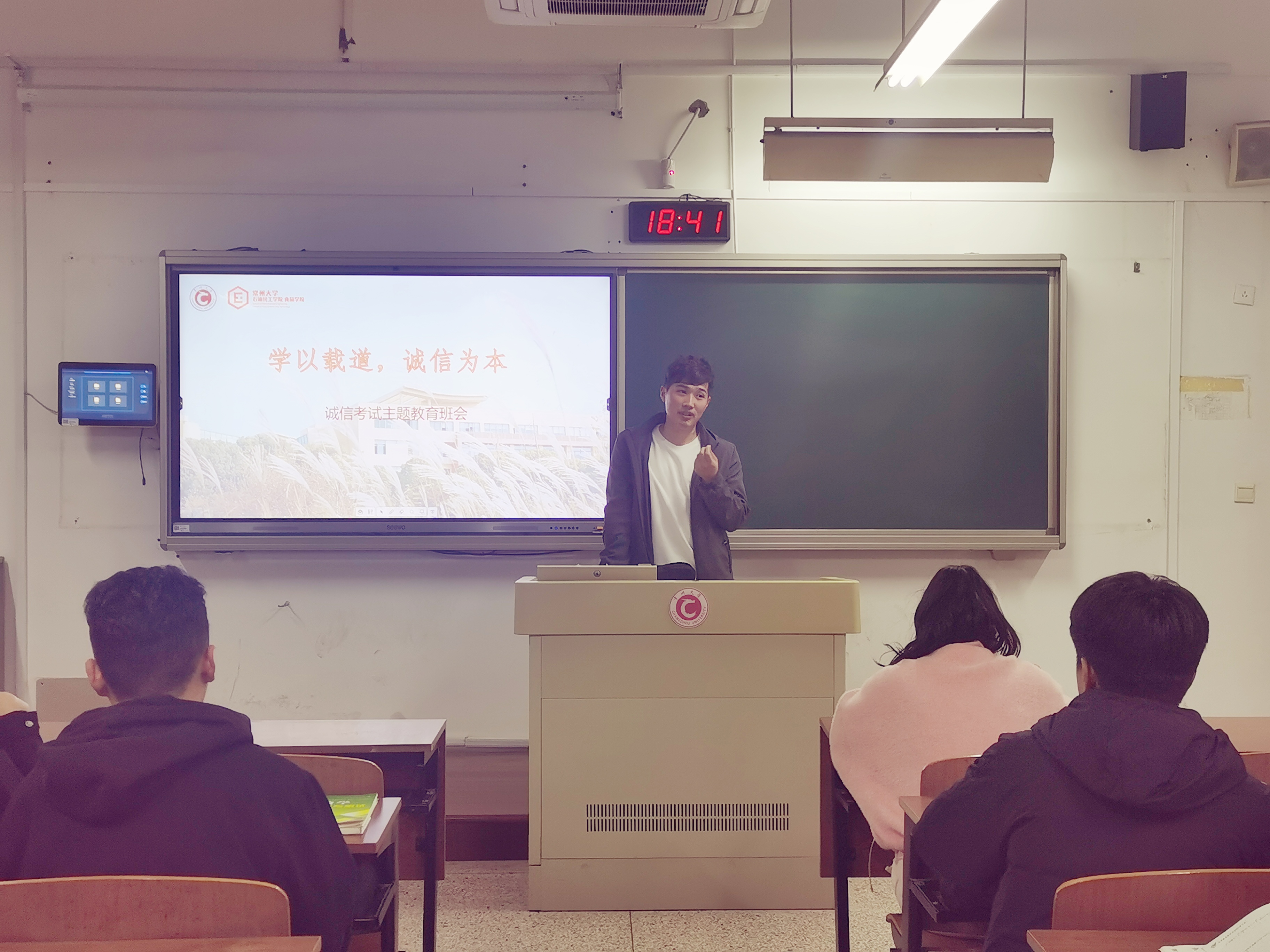 班會上,各班輔導(dǎo)員和班主任首先帶領(lǐng)同學(xué)們學(xué)習(xí)了學(xué)生手冊上有關(guān)誠信考試的相關(guān)內(nèi)容以及考試違紀(jì)、作弊處理辦法,讓同學(xué)們明白考試只是檢測所學(xué)知識的手段,是平時努力程度的集中反映,優(yōu)異的成績要靠自己的真實智慧和辛勤奮斗來爭取。同時,他們強調(diào)了四六級和期末考試的重要性,四級過關(guān)是完成學(xué)業(yè)的必須要求,期末考試是檢驗一學(xué)期學(xué)習(xí)成果的直接形式,是下一階段增強學(xué)習(xí)信心的重要支柱,囑咐同學(xué)們要抓住考試前的這段時間,認(rèn)真復(fù)習(xí),積極備考,多與同學(xué)、老師溝通,及時解決學(xué)習(xí)上的難點和障礙,要合理安排作息時間,要樹立主動學(xué)習(xí)、自主學(xué)習(xí)的意識,希望同學(xué)們都能以優(yōu)異的成績通過四六級和期末大考。此外,各班級同學(xué)們也結(jié)合學(xué)習(xí)生活實際闡述了自身對誠信的理解,剖析了誠信教育的必要性。隨后,各班級學(xué)生簽署了誠信考試承諾書,每個同學(xué)都在承諾書上莊重寫下自己的名字,簽署承諾書不僅是每個同學(xué)的鄭重承諾,更是同學(xué)們對誠信考試的決心。