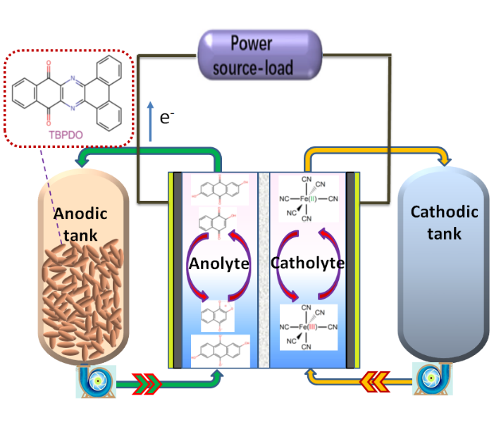 水系有機(jī)液流電池(AOFB)可使用具有高理論比容量、資源豐富、易規(guī)?;迫『铜h(huán)境友好的氧化還原活性有機(jī)分子/聚合物作為儲(chǔ)能電解質(zhì)材料,因而在大規(guī)模儲(chǔ)能方面應(yīng)用前景廣闊。然而,有機(jī)材料在水溶液體系中的較低溶解度和高粘度特性極大地限制了它們的實(shí)際應(yīng)用。我院曹劍瑜-許娟團(tuán)隊(duì)最近設(shè)計(jì)開(kāi)發(fā)了一種具有高比容量和快速的氧化還原反應(yīng)動(dòng)力學(xué)速率的有機(jī)固態(tài)儲(chǔ)能材料——三苯并[a,c,i]吩嗪-10,15-二酮(TBPDO), 通過(guò)利用TBPDO與兩種水溶性氧化還原穿梭分子(蒽黃酸和指甲花醌)之間能斯特電位驅(qū)動(dòng)的單分子氧化還原靶向(SMRT)反應(yīng),有效規(guī)避了有機(jī)活性電解質(zhì)材料的溶解度限制,從而顯著提高AOFB的能量密度。組建的以TBPDO為陽(yáng)極容量助推器的氧化還原靶向液流電池(RTFB)表現(xiàn)出顯著增強(qiáng)的容積比容量(能量密度)和高的材料利用率(80.2%)。在長(zhǎng)期充放電循環(huán)期間,每個(gè)循環(huán)的容量保持率達(dá)到99.82%,平均能量效率80.7%。