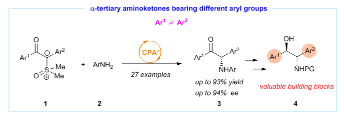 在進(jìn)行上述卡賓捕獲反應(yīng)時(shí),我們發(fā)現(xiàn)之前從未應(yīng)用于不對(duì)稱催化反應(yīng)的兩側(cè)含芳基取代的氧化硫葉立德1在手性酸催化下可順利進(jìn)行N-H插入反應(yīng)而獲得alpha-氨基酮3,文獻(xiàn)中已報(bào)道的該類型alpha-氨基酮的有效的不對(duì)稱催化合成方法很少,究其原因在于手性中心的不穩(wěn)定。基于此,我們通過手性磷酸催化的氧化硫葉立德的不對(duì)稱N-H插入反應(yīng)實(shí)現(xiàn)了該類氨基酮的不對(duì)稱催化合成。我們的方法尤其適合于合成含不同芳基取代基的alpha-氨基酮3,其在藥物合成,配體設(shè)計(jì),手性輔基設(shè)計(jì)等領(lǐng)域具有重要的應(yīng)用價(jià)值。