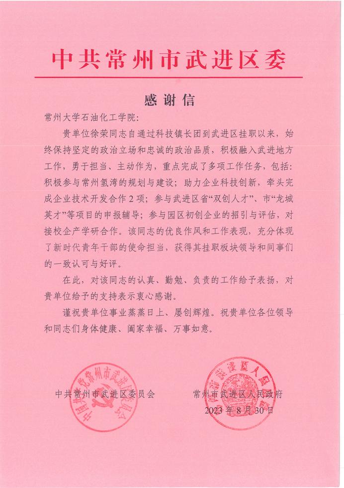 近日,我院收到來自中共常州市武進(jìn)區(qū)委的感謝信。信中對我院徐榮同志在武進(jìn)區(qū)掛職工作過程中,勇于擔(dān)當(dāng)、主動作為、認(rèn)真勤勉的工作作風(fēng),以及善于溝通協(xié)調(diào)、專業(yè)技能過硬的綜合能力,予以認(rèn)可和表揚,并致以衷心的感謝。
