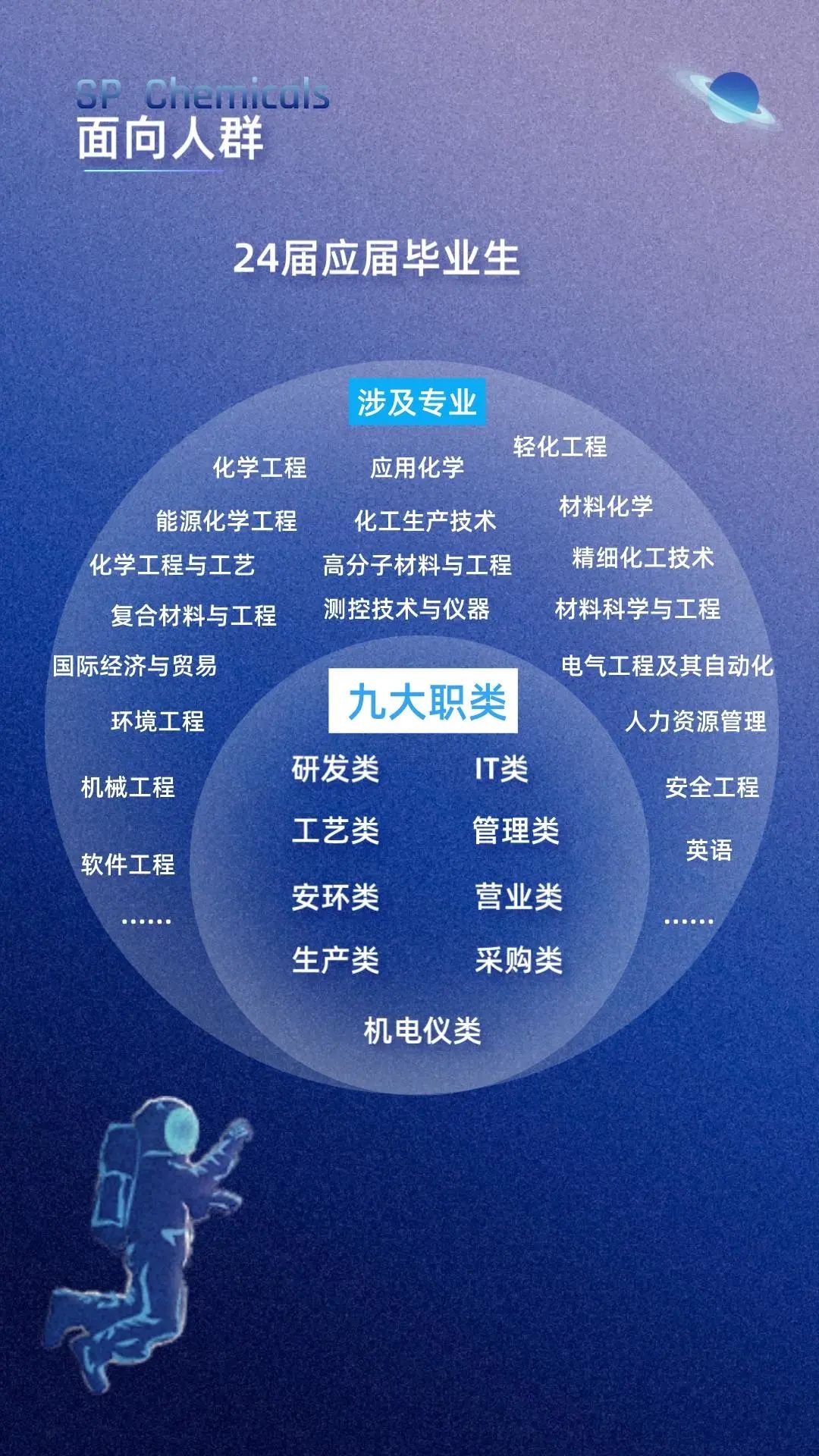 研發(fā)技術(shù)員、工藝工程師(儲(chǔ)備)、化工作業(yè)員、儀表保養(yǎng)作業(yè)員、機(jī)械設(shè)備保養(yǎng)作業(yè)員、HSE技術(shù)員、IT技術(shù)員、行政專(zhuān)員、采購(gòu)員、營(yíng)業(yè)員、外貿(mào)員等