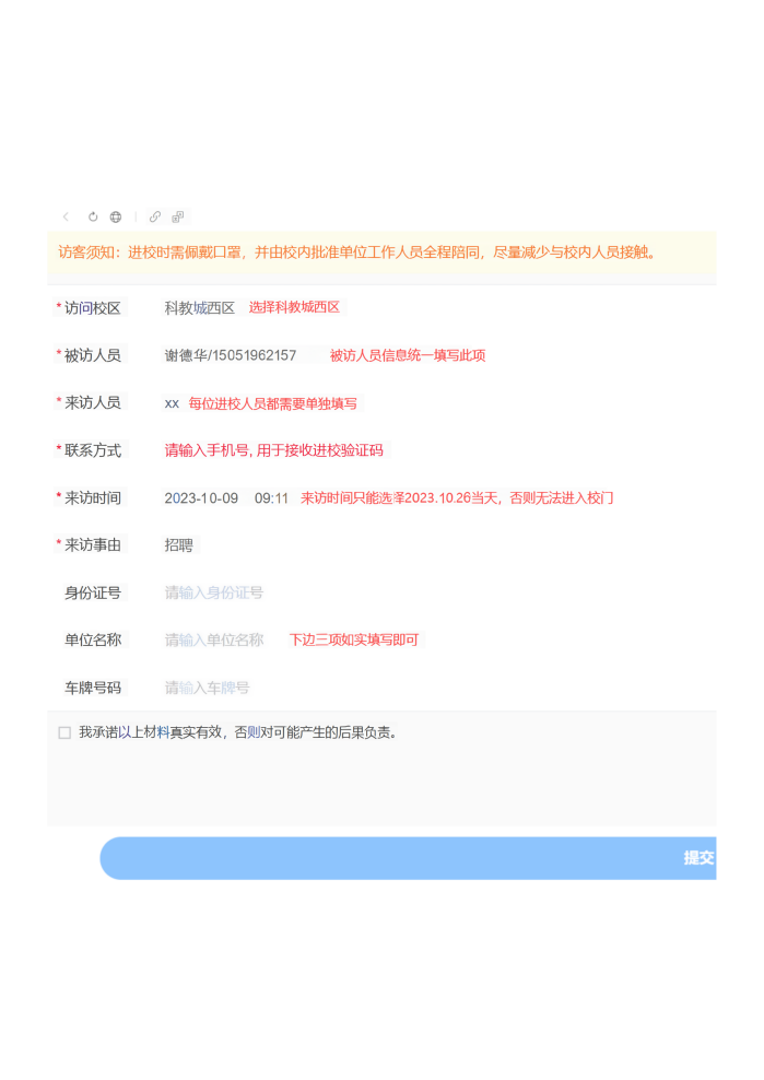 ③信息填寫完畢后點(diǎn)擊提交,審核通過后將收到預(yù)約信息登記成功短信并附帶入校鏈接,入校時(shí)請(qǐng)點(diǎn)擊鏈接生成入校二維碼并向門衛(wèi)出示即可。