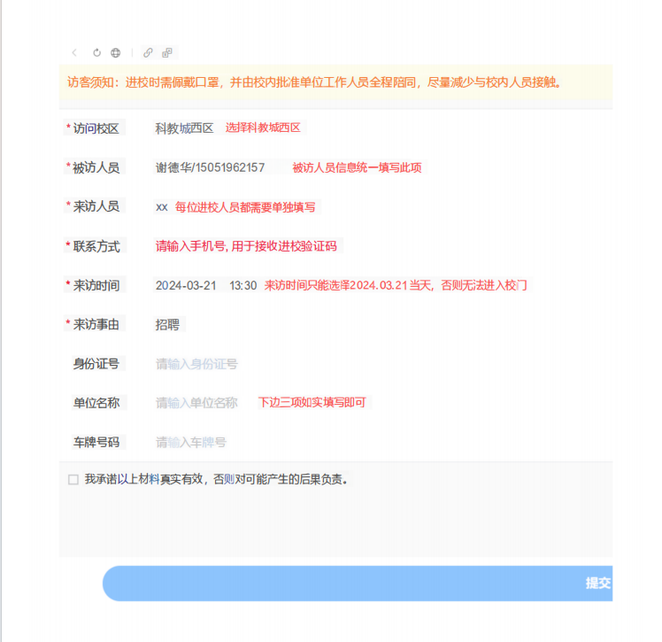 ③信息填寫完畢后點擊提交,審核通過后將收到預(yù)約信息登記成功短信并附帶入校鏈接,入校時請點擊鏈接生成入校二維碼并向門衛(wèi)出示即可。