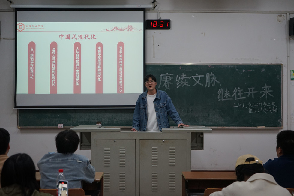 李成旭向同學們介紹了近現(xiàn)代中國現(xiàn)代化進程與歷史、改革開放后中國現(xiàn)代化問題的提出,使同學們明確了黨的十八大以后中國式現(xiàn)代化的發(fā)展目標。張志豪從傳統(tǒng)節(jié)日、六大建筑派系、傳統(tǒng)文化遺產(chǎn)著手,帶領同學領略了傳統(tǒng)文化的魅力,同時強調(diào)了傳承傳統(tǒng)文化的重要性和必要性。望我院的學生通過此次講座能夠結(jié)合所學專業(yè),利用所學知識,推動傳統(tǒng)文化的傳承與創(chuàng)新,堅定文化自信,為中國式現(xiàn)代化的推進作出獨屬于大學生的特別貢獻。