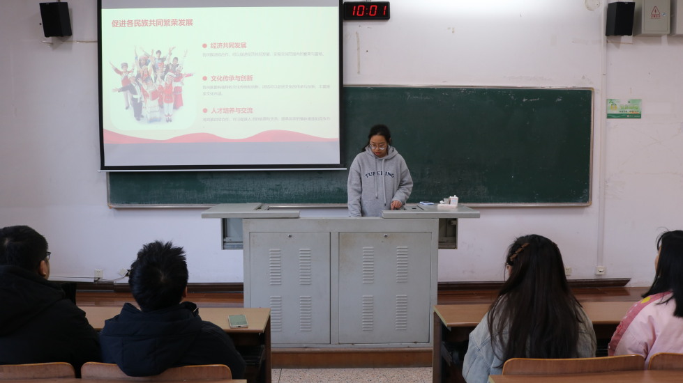 為了促進各民族的團結(jié)友愛、構(gòu)建和諧美好的民族大家庭,我院于12月29日在W1202教室開展了主題為“民族團結(jié)一家親,同心共筑中國夢”的宣講活動。宣講會上,謝露深入淺出地圍繞民族團結(jié)的關(guān)鍵意義、中國夢的豐富內(nèi)涵與意義、民族團結(jié)與中國夢之間的緊密聯(lián)系以及青少年踐行方式四個核心維度,帶領(lǐng)大家深入解讀中國夢和民族團結(jié)的關(guān)系。朱一飛與各位同學(xué)交流了各民族風(fēng)俗,宣傳了宗教與教育相分離原則。通過本次宣講活動,同學(xué)們對民族團結(jié)和中國夢有了更深的理解和感悟,同時也激發(fā)了他們的責(zé)任感與使命感。