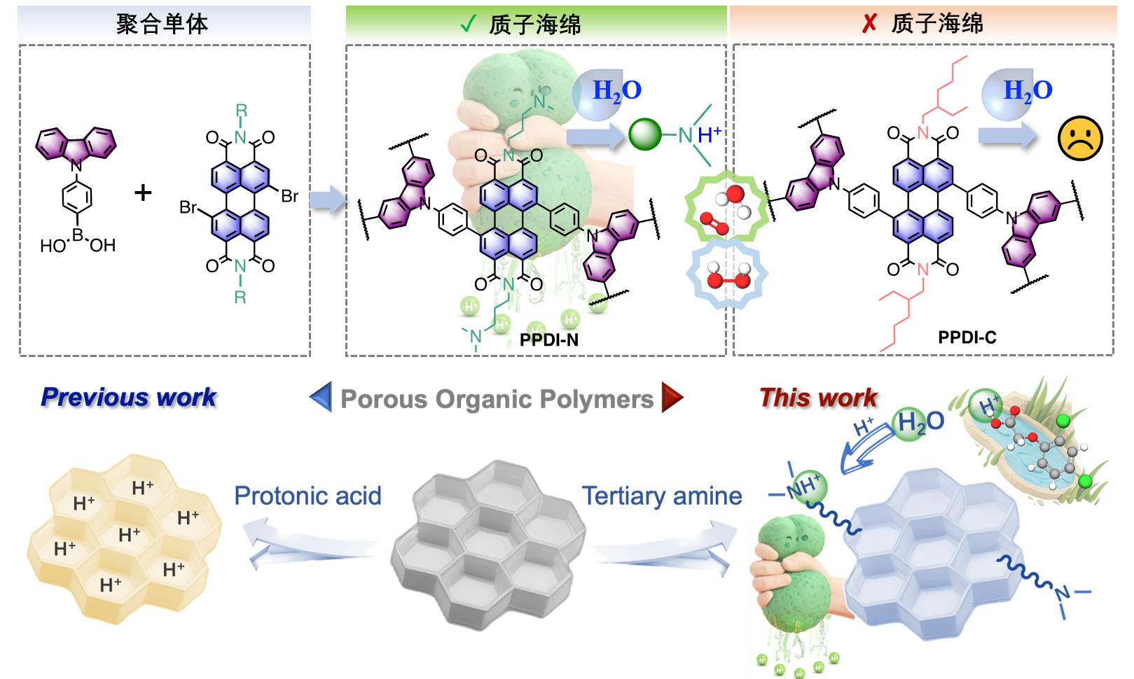 圖1 苝酰亞胺類CMPs光催化材料的合成路線、“質(zhì)子海綿”概念的提出及其相比已報(bào)道的工作的優(yōu)勢(shì)