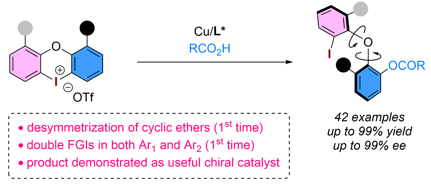 高效構(gòu)建軸向手性二芳基醚(ACDEs)是有機合成中一項重要且新興但極具挑戰(zhàn)性的任務(wù)?,F(xiàn)有基于去對稱化策略的成功案例僅限于非環(huán)芳基醚,且僅能對四個取代基中的一個進行單一修飾,模塊化程度較低。黃海和孫建偉課題組近日首次開發(fā)了一種雙取代基同步修飾的對映選擇性合成策略,實現(xiàn)了ACDEs結(jié)構(gòu)的靈活多樣化構(gòu)建。基于環(huán)狀二芳基碘鎓鹽的開環(huán)反應(yīng),建立了一種溫和的銅催化方法,在溫和條件下實現(xiàn)了優(yōu)異的反應(yīng)效率、對映選擇性和良好的區(qū)域選擇性。所獲得的高對映體純度ACDEs產(chǎn)物可作為高效手性催化劑應(yīng)用于不對稱合成領(lǐng)域。