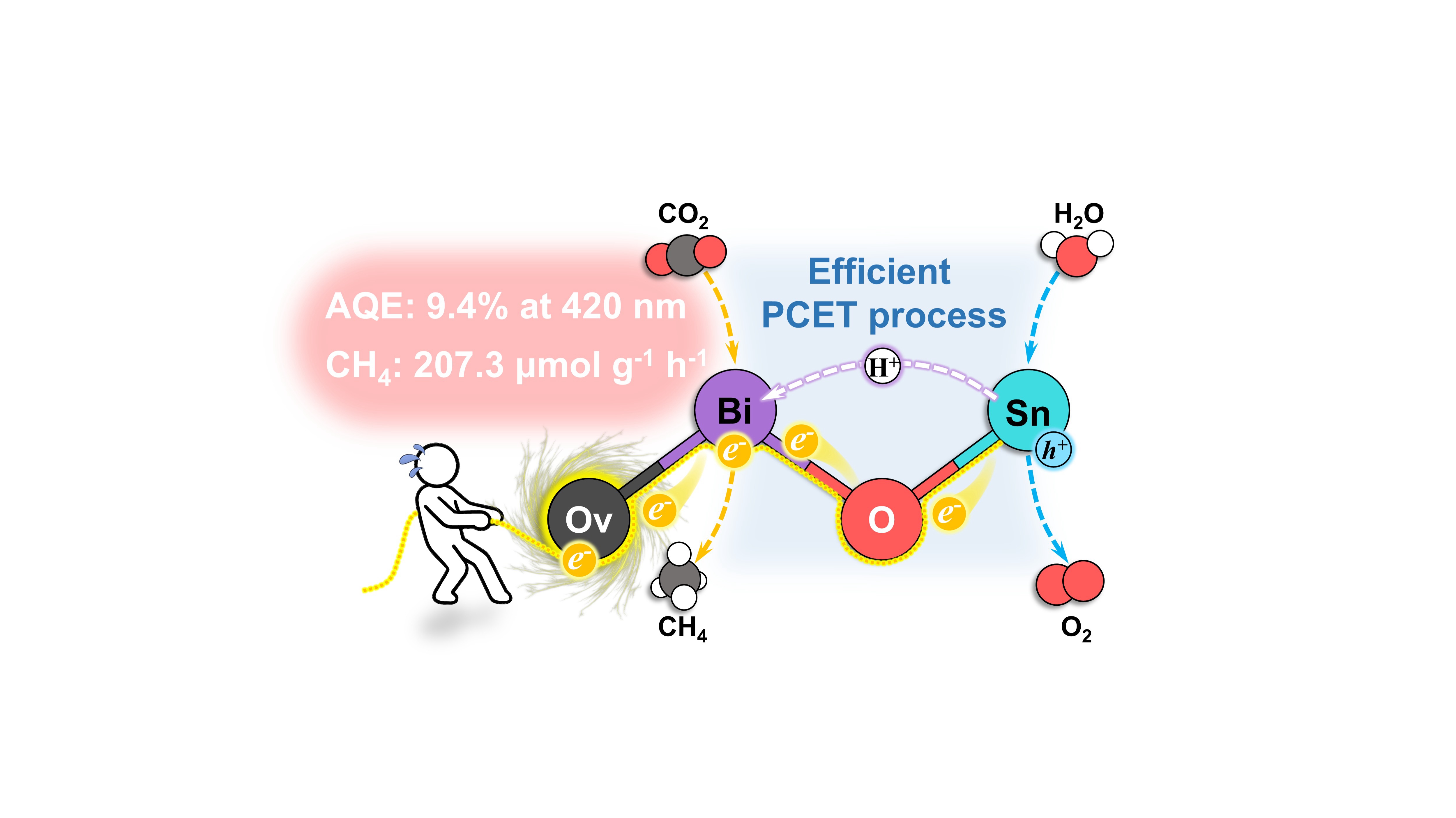 (1)通過氧空位誘導(dǎo)生成Bi-O-Sn氧化還原位點,極大增強了質(zhì)子耦合電子傳遞(PCET)過程。該研究通過調(diào)控Bi的電子結(jié)構(gòu),優(yōu)化Bi 6p與*CHO 2p 軌道雜化,顯著降低了關(guān)鍵中間體*CHO的能壘,表現(xiàn)出卓越的催化性能,CH4產(chǎn)率達207.3 μmol g-1 h-1,選擇性為95.7%。相關(guān)成果以“Oxygen Vacancy-Driven Asymmetrical Charge Distribution on Bi-O-Sn Sites in Sn-Doped Bi2MoO6 for Efficient Photocatalytic CO2-to-CH4 Conversion”為題發(fā)表在Angewandte Chemie International Edition(Angew. Chem. Int. Ed. 2025, e21874)。