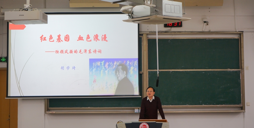 胡學(xué)琦以毛澤東詩詞為線索,從毛澤東與詩詞、革命歷程、精神心路與美學(xué)特征四方面展開,生動(dòng)解讀詩詞背后的黨史與革命情懷;他帶領(lǐng)同學(xué)們回顧從“誰主沉浮”的豪情到“星火燎原”的膽識(shí),展現(xiàn)了毛澤東詩詞作為“詩化黨史”的深刻內(nèi)涵,并剖析其中蘊(yùn)含的崇高精神與人文哲思。講座尾聲,胡學(xué)琦引用“數(shù)風(fēng)流人物,還看今朝”,鼓勵(lì)同學(xué)們傳承紅色精神,勇?lián)鷷r(shí)代使命。