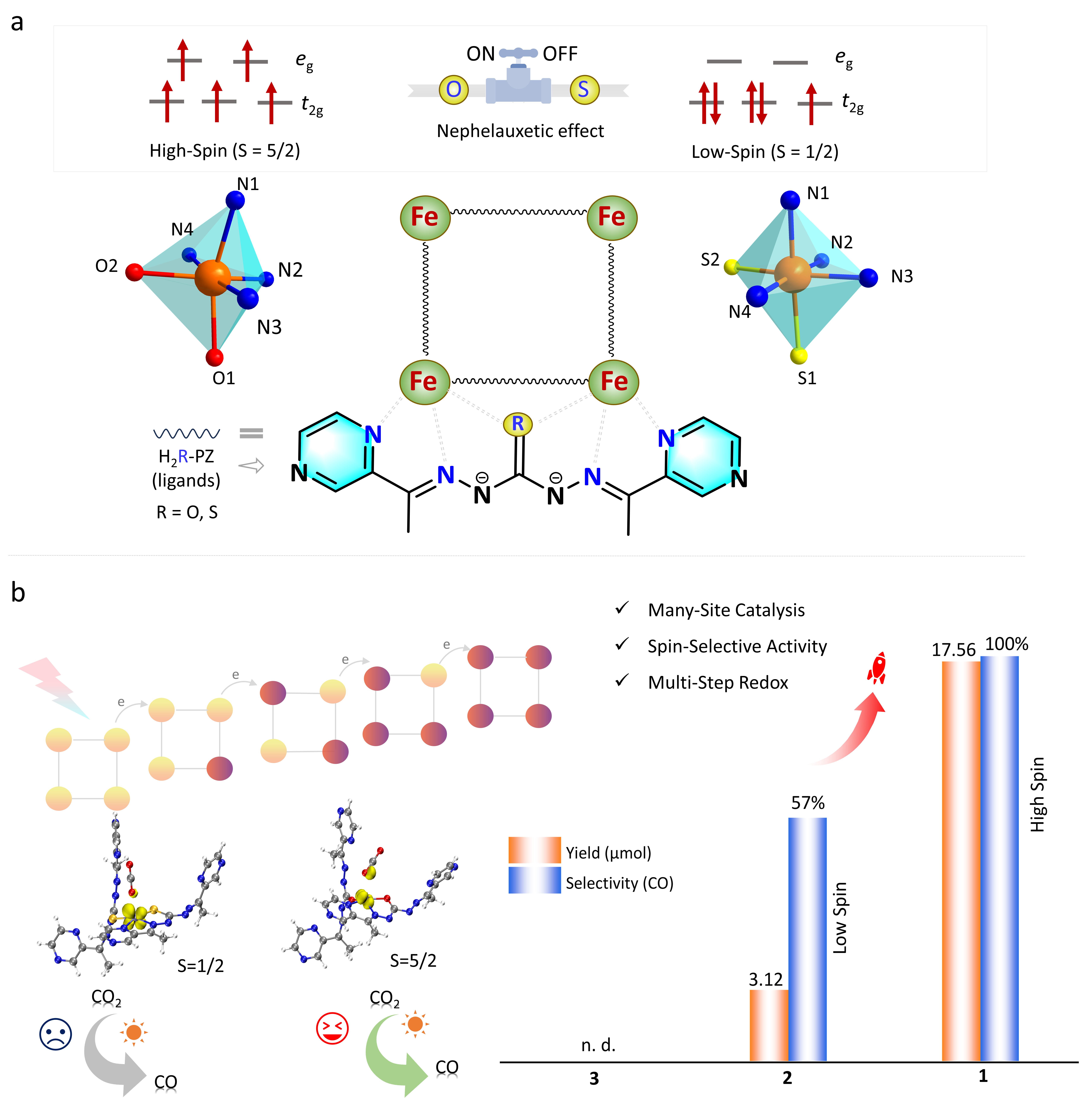 課題組針對催化中心自旋態(tài)在原子尺度上的精準調控難題,提出了一種超分子自組裝新策略:通過構建基于π?π堆積的長程有序結構,并巧妙利用配體的Nephelauxetic 效應,僅通過替換單個橋原子即實現(xiàn)了Fe3+中心在高自旋與低自旋態(tài)之間的可控切換,成功制備了自旋態(tài)可調的Fe4團簇超薄納米層(圖2)。研究表明,高自旋態(tài)Fe3+團簇具有更優(yōu)異的電子轉移能力,可顯著促進光生載流子分離與傳輸,在CO2還原反應中表現(xiàn)出接近100%的CO選擇性及遠優(yōu)于低自旋體系的催化活性。理論計算進一步闡明,高自旋態(tài)Fe3+與CO2之間存在更強的軌道相互作用,不僅能增強CO2吸附,還可降低關鍵中間體形成的吉布斯自由能。該工作不僅為設計具有自旋調控功能的CO2光還原催化劑提供了新穎的超結構模型,也深化了對自旋態(tài)影響人工光合作用過程機制的認識。