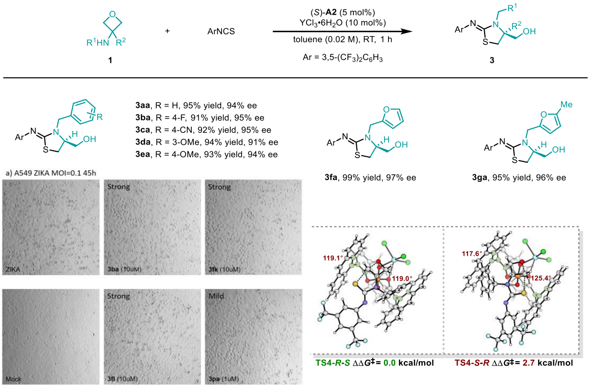 近日,常州大學(xué)孫建偉、黃海、韓政宇等人報(bào)道了一種用于3-氨基氧雜環(huán)丁烷與異硫氰酸酯對(duì)映選擇性環(huán)化構(gòu)建手性2-亞氨基噻唑烷的二元催化體系。該工作采用手性磷酸與路易斯酸組成的二元催化體系,在溫和條件一步構(gòu)建了具有多個(gè)可調(diào)取代基的手性2-亞氨基噻唑烷骨架。作者通過(guò)對(duì)照實(shí)驗(yàn)、中間體捕獲嘗試以及DFT計(jì)算系統(tǒng)闡明了反應(yīng)機(jī)理,揭示手性磷酸負(fù)責(zé)活化氧雜環(huán)丁烷進(jìn)行分子內(nèi)SN2開(kāi)環(huán),而路易斯酸并不直接活化底物,而是通過(guò)增強(qiáng)手性磷酸的酸性和剛性來(lái)提升其催化性能,其中過(guò)渡態(tài)中N–H···O–P氫鍵的穩(wěn)定作用及催化劑構(gòu)象的不利扭曲是決定對(duì)映選擇性的關(guān)鍵因素。該研究進(jìn)一步發(fā)現(xiàn)所得手性產(chǎn)物對(duì)寨卡病毒(ZIKV)具有顯著抑制活性,在低細(xì)胞毒性下可使病毒RNA水平降低80%以上,凸顯了該類化合物作為新型抗病毒先導(dǎo)結(jié)構(gòu)的巨大潛力,為抗病毒藥物研發(fā)提供了新的化學(xué)空間。