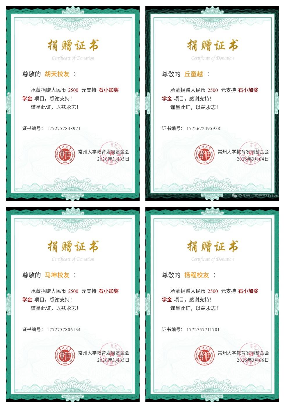 近日,我院設立的石小加獎學金迎來了薪火傳遞的溫暖一刻。首批獲獎學生中,已畢業(yè)深造的四位校友主動履行獎學金設立時的“愛心反饋”承諾,將獎學金總額的50%捐贈回學校,用于繼續(xù)獎勵資助品學兼優(yōu)的在讀學子。這一舉動不僅兌現了當年的約定,更以實際行動詮釋了感恩與責任,為“石小加”精神寫下了最生動的注腳。