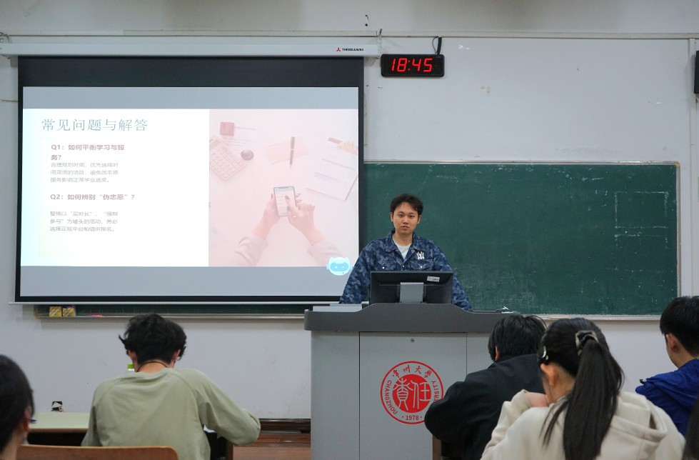 會上,兩位同學(xué)結(jié)合個人經(jīng)歷,圍繞志愿精神內(nèi)涵、個人服務(wù)經(jīng)歷、能力提升指南及未來展望展開分享。王梓豪為同學(xué)們分享了幾段個人志愿服務(wù)經(jīng)歷,鼓勵同學(xué)們主動參與志愿實踐,在服務(wù)中迎難而上、收獲成長。宋羽凡則補充選擇項目應(yīng)結(jié)合興趣、專業(yè)與課余時間,通過正規(guī)渠道參與,平衡好學(xué)業(yè)與服務(wù)。