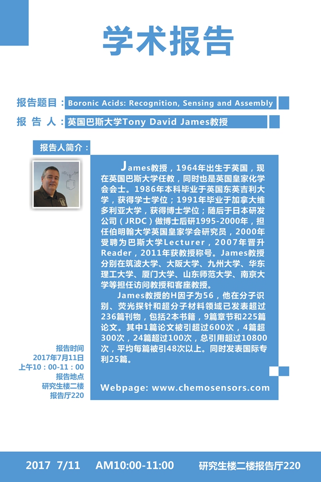 | 【學(xué)術(shù)】7月11日學(xué)術(shù)報告 —Boronic Acids:Recognition,Sensing and Assembly |