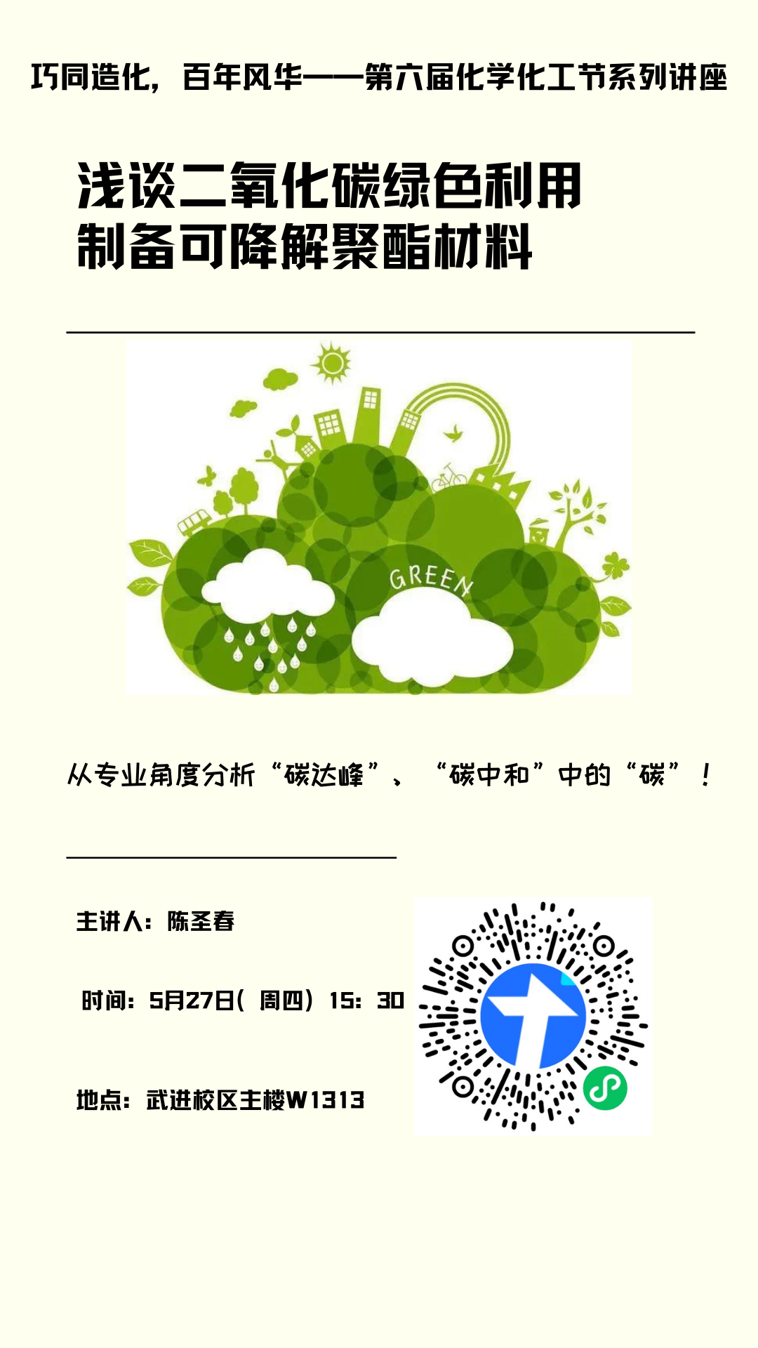 【講座】5月27日科普講座《淺談二氧化碳綠色利用制備可降解聚酯材料》---陳圣春