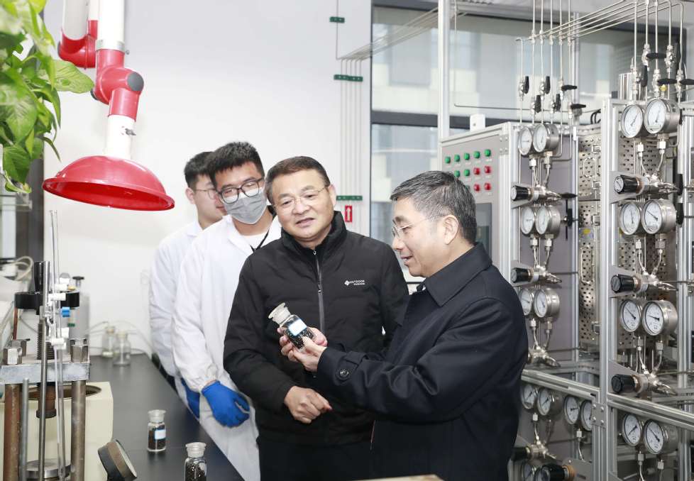 江涌一行實地考察了國家級實驗教學(xué)示范中心、江蘇省先進(jìn)催化與綠色制造協(xié)同創(chuàng)新中心、綠色催化材料與技術(shù)重點實驗室和中以機(jī)器人產(chǎn)業(yè)學(xué)院,重點問詢了學(xué)校大型儀器開放共享管理機(jī)制運行,詳細(xì)了解了學(xué)校的發(fā)展歷程、人才培養(yǎng)、科學(xué)研究、社會服務(wù)等領(lǐng)域取得的發(fā)展成果。他表示,常州大學(xué)作為一所多學(xué)科協(xié)調(diào)發(fā)展、具有產(chǎn)學(xué)研緊密結(jié)合辦學(xué)特色的高水平大學(xué),近年來在支撐服務(wù)地方經(jīng)濟(jì)社會高質(zhì)量發(fā)展、石油石化行業(yè)轉(zhuǎn)型升級等方面取得了顯著成績,希望學(xué)校再接再厲,踔厲奮發(fā),在新征程上展現(xiàn)更大作為、實現(xiàn)更大突破。 江涌強(qiáng)調(diào),在當(dāng)前高等教育戰(zhàn)略布局調(diào)整、江蘇打造具有全球影響力的產(chǎn)業(yè)科技創(chuàng)新中心、常州“新能源之都”建設(shè)的大背景下,學(xué)校要以更高站位加強(qiáng)黨的全面領(lǐng)導(dǎo),堅持黨委領(lǐng)導(dǎo)下的校長負(fù)責(zé)制,落實立德樹人根本任務(wù),把習(xí)近平總書記關(guān)于教育的重要論述精神、關(guān)于江蘇工作的重要指示精神、給江蘇師生回信精神貫穿辦學(xué)治校、人才培養(yǎng)全過程各環(huán)節(jié);要以更實舉措深化內(nèi)涵建設(shè),加強(qiáng)化學(xué)工程與技術(shù)、石油與天然氣工程等能源化工優(yōu)勢特色學(xué)科建設(shè),積極構(gòu)建“國內(nèi)有地位、國際有影響”的能源化工學(xué)科群,加快建設(shè)國家級示范性專業(yè)特色學(xué)院、現(xiàn)代產(chǎn)業(yè)學(xué)院、創(chuàng)新創(chuàng)業(yè)學(xué)院;要以更大作為服務(wù)高質(zhì)量發(fā)展,圍繞服務(wù)國家發(fā)展的戰(zhàn)略需求,用好石油系統(tǒng)的寶貴資源,著力打造集基礎(chǔ)研究、應(yīng)用開發(fā)、成果轉(zhuǎn)移一體化的創(chuàng)新鏈條,加快推動更多科技創(chuàng)新成果轉(zhuǎn)化,助力區(qū)域產(chǎn)業(yè)科技創(chuàng)新中心建設(shè);要以更強(qiáng)責(zé)任維護(hù)校園安全穩(wěn)定,對校園消防安全、實驗室及危化品安全、建筑施工安全、食品衛(wèi)生安全等開展全方面、全覆蓋、常態(tài)化大排查、大整治,全面加強(qiáng)學(xué)校安全教育、培訓(xùn)和演練,持續(xù)實施關(guān)愛青少年心理健康“潤心”行動,全力維護(hù)師生安全和教育穩(wěn)定大局。