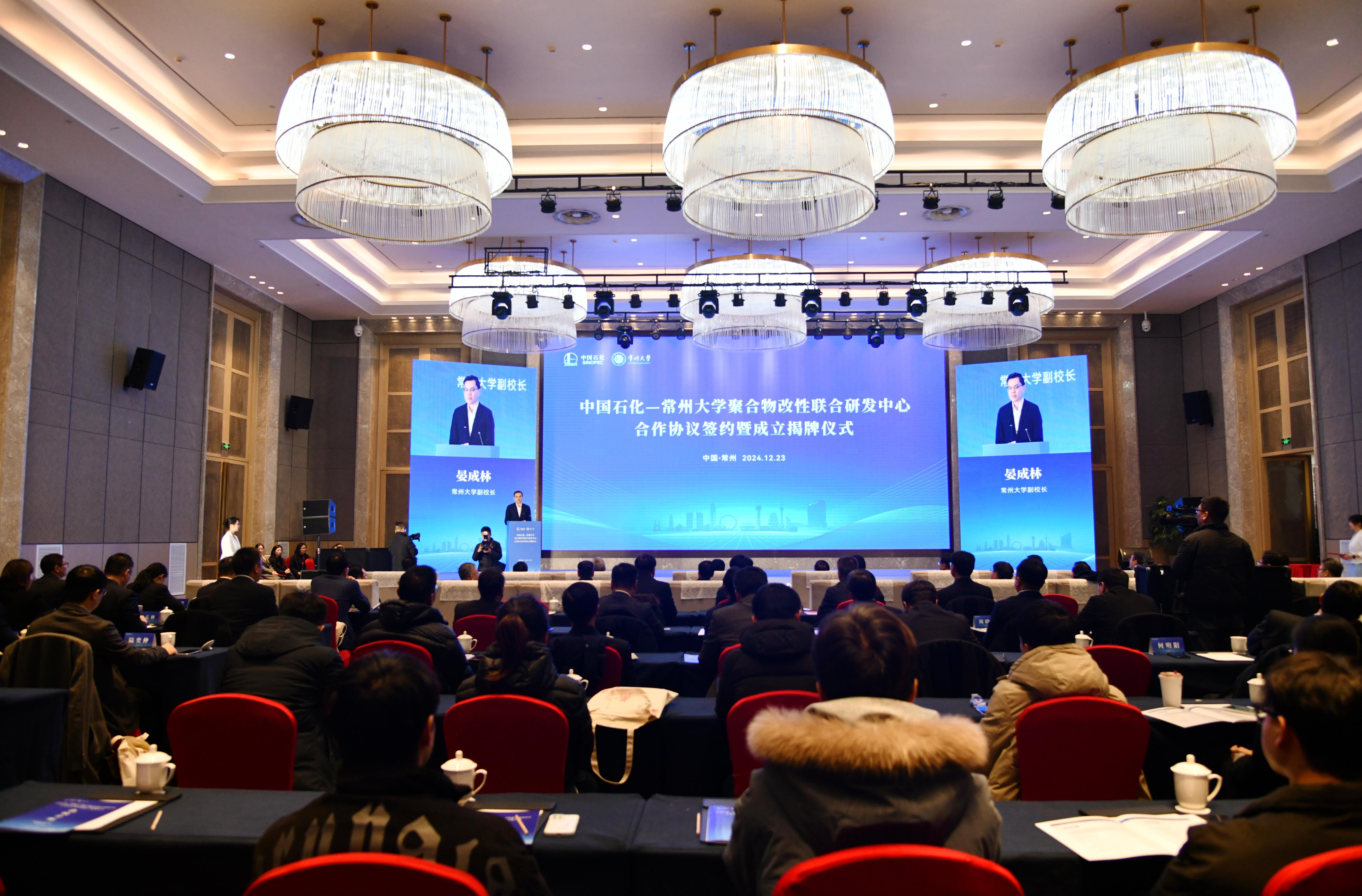 12月23日,中國(guó)石化—常州大學(xué)聚合物改性聯(lián)合研發(fā)中心(簡(jiǎn)稱“聯(lián)合研發(fā)中心”)合作協(xié)議簽約暨成立揭牌儀式在常州舉行。中國(guó)工程院院士謝克昌,中國(guó)石油化工集團(tuán)有限公司黨組成員、副總經(jīng)理、股份公司高級(jí)副總裁李永林,科技部總經(jīng)理卞鳳鳴,綜合管理部副主任、黨組辦公室副主任鐘文標(biāo),化工事業(yè)部副總經(jīng)理王立東,化工銷售江蘇分公司總經(jīng)理李楚新,揚(yáng)子石化副總經(jīng)理劉文豹,化工銷售公司副總經(jīng)理錢斌,北京化工研究院副院長(zhǎng)高達(dá)利,科技部集團(tuán)首席專家莊毅等相關(guān)領(lǐng)導(dǎo),常州市人民政府副市長(zhǎng)蔣鵬舉,武進(jìn)區(qū)委常委、常州西太湖科技產(chǎn)業(yè)園黨工委書記徐俊,常州大學(xué)黨委副書記、校長(zhǎng)陳海群,原黨委書記陳群,黨委常委、副校長(zhǎng)李忠玉,黨委常委、副校長(zhǎng)彭明國(guó),黨委常委、副校長(zhǎng)李亞飛,副校長(zhǎng)晏成林出席會(huì)議,常州大學(xué)相關(guān)部門、學(xué)院負(fù)責(zé)人及教師代表參加會(huì)議。晏成林主持會(huì)議。 晏成林主持會(huì)議