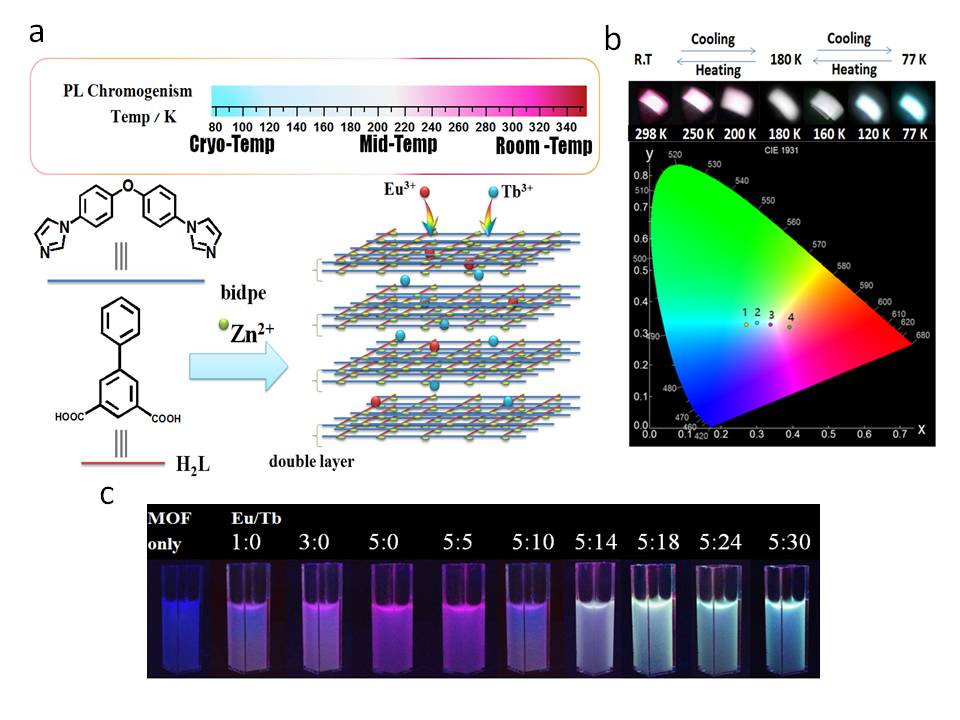 Tuning the Solid-State White Light Emission of Postsynthetic Lanthanide-Encapsulated Double-Layer MOFs for Three-Color Luminescent Thermometry Applications Liya Qiu?, Chengfeng Yu?, Xiaoling Wang?, Yangbin Xie?, Alexander M. Kirillov?§, Wei Huang*?, Jipeng Li?, Peng Gao?, Ting Wu?, Xiangwei Gu?, Qi Nie?, and Dayu Wu*? ? Jiangsu Key Laboratory of Advanced Catalytic Materials and Technology, Advanced Catalysis and Green Manufacturing Collaborative Innovation Center, School of Petrochemical Engineering, Changzhou University, Changzhou, Jiangsu213164, People’s Republic of China. ? Centro de Quimica Estrutural, Instituto Superior Tecnico, Universidade de Lisboa, Av. Rovisco Pais, 1049-001 Lisbon, Portugal. § Peoples’ Friendship University of Russia (RUDN University), 6 Miklukho-Maklayast., Moscow 117198, Russian Federation. 近日,吳大雨課題組通過(guò)后修飾方法成功合成了一例稀土嵌入二維雙層金屬有機(jī)框架(MOF)晶態(tài)材料,通過(guò)精準(zhǔn)調(diào)控稀土離子的摻雜比例,實(shí)現(xiàn)了MOF材料的全彩色指紋發(fā)光。這類(lèi)二維材料展現(xiàn)出優(yōu)良的溫度傳感功能,對(duì)溫度變化反應(yīng)靈敏、可逆切換。有望應(yīng)用在寬溫區(qū)(幾K到670 K)以及極端環(huán)境下的溫度計(jì)領(lǐng)域。 原文鏈接:https://pubs.acs.org.ccindex.cn/doi/pdf/10.1021/acs.inorgchem.9b00084.