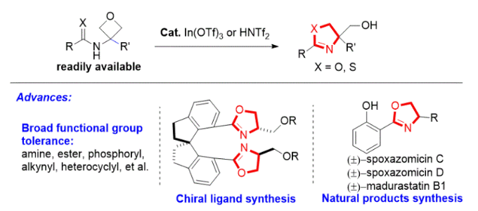 A Mild Catalytic Synthesis of 2-Oxazolines via Oxetane Ring-Opening: Rapid Access to A Diverse Family of Natural Products Hai Huang,Wen Yang,Zuliang Chen,Zengwei Laiand Jianwei Sun* 近日,孫建偉和黃海教師課題組在化學(xué)國際頂級刊物Chemical Science上發(fā)表題為“A Mild Catalytic Synthesis of 2-Oxazolines via Oxetane Ring-Opening: Rapid Access to A Diverse Family of Natural Products”的研究論文。論文通訊聯(lián)系人為孫建偉教授,第一作者為石油化工學(xué)院新進(jìn)青年教師黃海博士。噁唑啉類化合物在生物活性分子以及金屬配體中都有廣泛的應(yīng)用。關(guān)于該類化合物的合成目前只能依賴于非催化地胺基醇或者N-烯丙基甲酰胺類化合物的環(huán)合反應(yīng)。該工作巧妙地將甲酰胺鍵引入到氧雜環(huán)丁烷分子中從而實(shí)現(xiàn)其分子內(nèi)開環(huán)反應(yīng)。該方法發(fā)展了一種催化合成噁唑啉環(huán)的方法,同時兼具條件溫和、高效性、優(yōu)越的官能團(tuán)容忍性等優(yōu)點(diǎn)。通過該方法不僅能夠?qū)崿F(xiàn)新型手性配體地合成,同時能夠快速地合成系列天然產(chǎn)物包括(±)-Spoxazomicin C, (±)-Madurastatin B1和(±)-Spoxazomicin D。 Chemical Science是是英國皇家化學(xué)會(RSC)旗艦刊物,2019年影響因子為9.556。中科院分區(qū)為一區(qū),TOP及Nature Index刊物。該期刊發(fā)表綜合化學(xué)領(lǐng)域的高水平論文,致力于為化學(xué)領(lǐng)域研究人員的學(xué)術(shù)觀點(diǎn)和學(xué)術(shù)信息交流提供一個國際化、高質(zhì)量的學(xué)術(shù)交流期刊平臺。