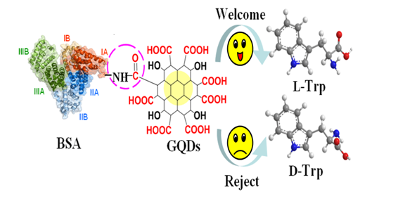 Covalent Functionalization of Bovine Serum Albumin with Graphene Quantum Dots for Stereospecific Molecular RecognitionQiumin Ye, Lili Guo, Datong Wu, Baozhu Yang, Yongxin Tao, Linhong Deng, Yong Kong* 原文鏈接:https://pubs.acs.org/doi/10.1021/acs.analchem.9b02605 牛血清白蛋白(BSA)是一種研究廣泛的血清蛋白,因其具有易溶、成本低、生物相容性高等優(yōu)點已引起研究者的廣泛關(guān)注。近日,課題組制備了BSA 與石墨烯量子點(GQDs)的復(fù)合材料,并將其成功應(yīng)用于色氨酸(Trp)對映體的電化學(xué)識別。GQDs與BSA之間的酰胺化反應(yīng)形成的酰胺鍵破壞了BSA原有的規(guī)整形貌,改變了BSA整體肽鏈的空間構(gòu)型,使BSA分子原本的三維心形結(jié)構(gòu)得以擴展,從而使肽鏈上的手性中心更易于暴露,提高了BSA-GQDs復(fù)合物的識別效率。
